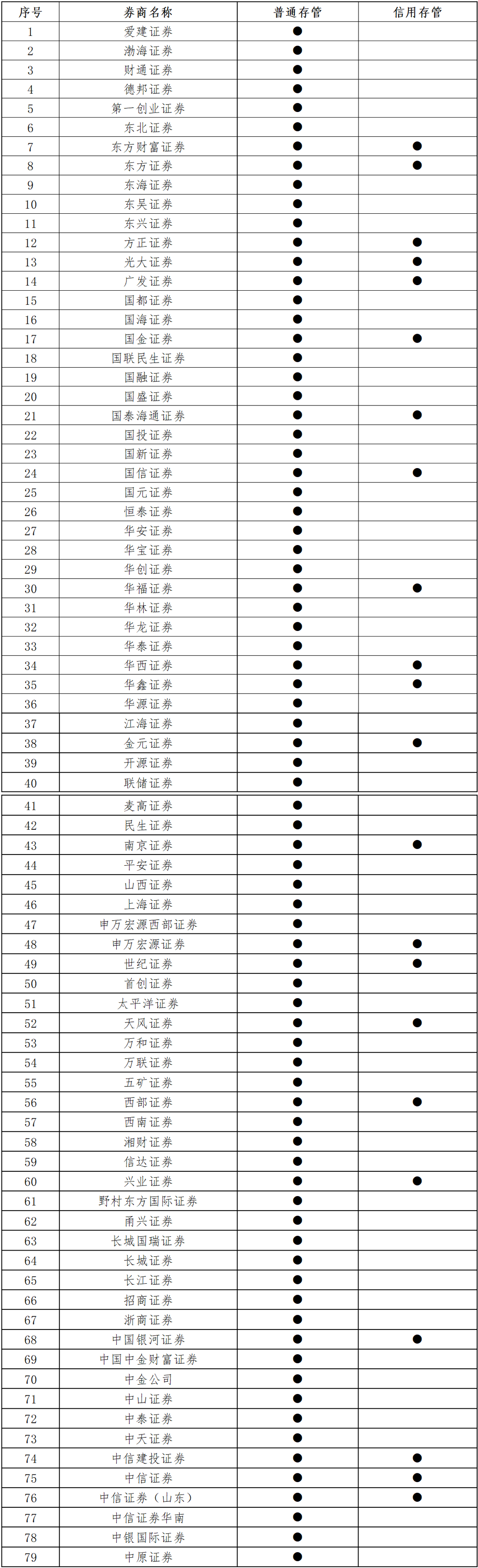 截至目前,我行三方存管业务的合作证券公司共79家,其中同时合作普通存管和信用存管的共22家。具体名单如下(按拼音排序,排名不分先后):