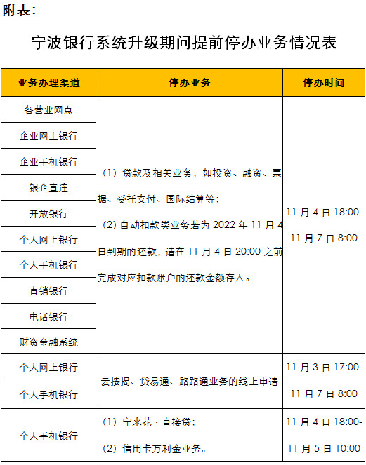 1、2022年11月4日18:00-11月7日8:00期间,我行贷款及相关业务,如融资、票据、受托支付、国际结算等业务将暂停服务;自动扣款类业务若为2022年11月4日到期还款的,请在11月4日20:00之前完成对应扣款账户的还款资金存入;云按揭、贷易通、路路通的线上申请业务将于2022年11月3日17:00-11月7日8:00停办。
